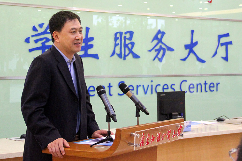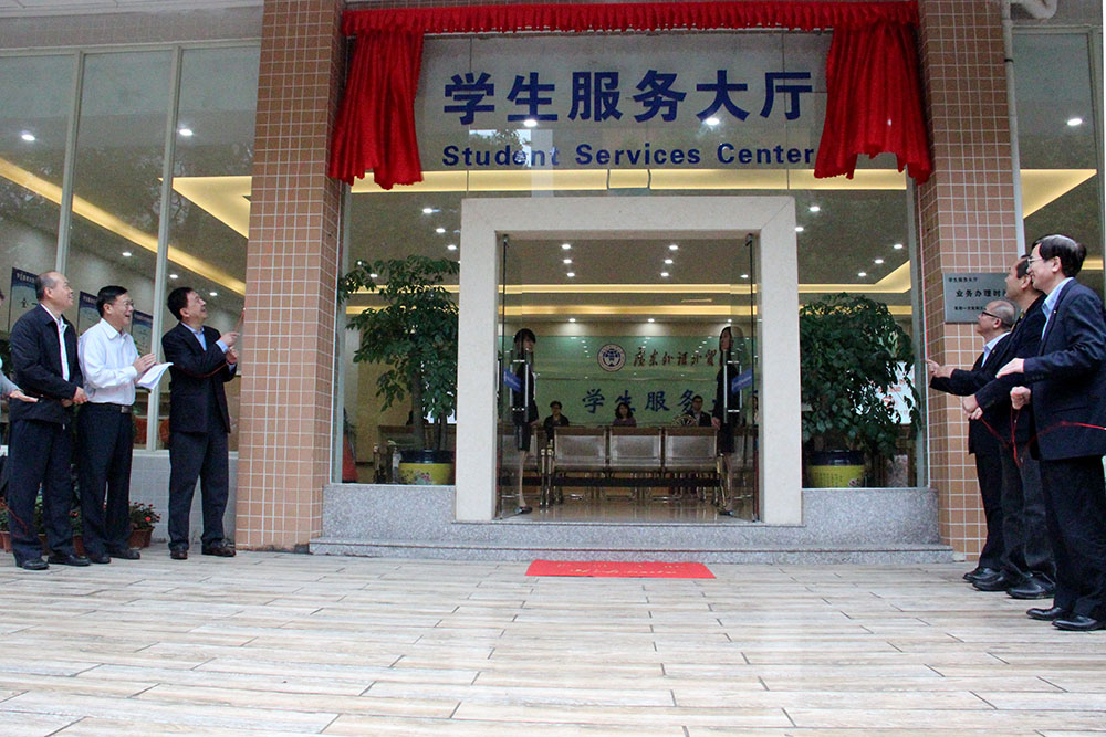 隋广军、卢景辉、何传添以及校董代表熊韶辉为学生服务大厅揭牌,学生服务大厅正式启用。据悉,学生服务大厅秉乘“一切为了学生、为了一切学生、为了学生一切”的服务理念,于每周一至周五定时开放。开放期间,学生工作部(处)、校团委、就业指导中心、研究生工作部(处)、教务处等职能部门集中现场办公,形成协作办事机制,为学生提供高效、便捷的服务。资讯和服务内容包含学生资助管理、就业指导、共青团建设及学生在校学习生活等方面的问题,对我校学生学习、生活、就业等实行“一站式服务”。