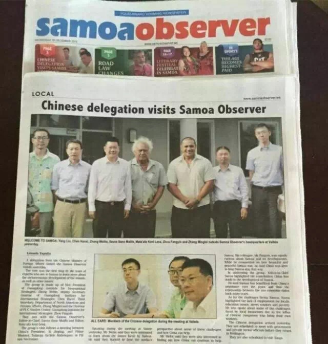 12月8日,代表团抵达南太岛国调研第一站萨摩亚,访问当地主要媒体《萨摩亚观察家日报》(Samoa Observer),与主编Savea Sano Malifa和副主编Mata`afa Keni Lesa座谈交流。