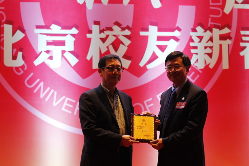 何传添为北京校友会第三届理事会会长王毅颁发聘书,并见证了第二、第三届会长交换仪式。