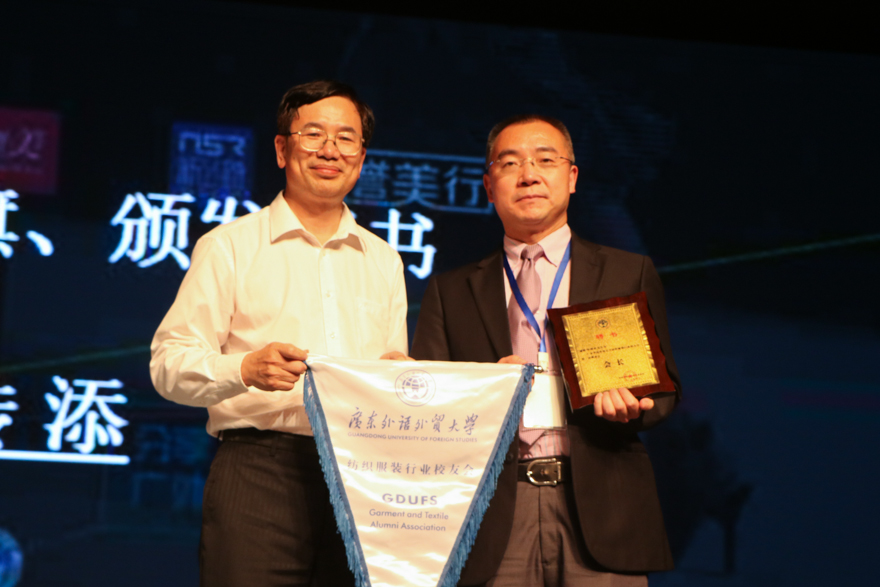 随后,何传添为广外纺织服装校友会首任会长杨明玖颁发证书并授旗。