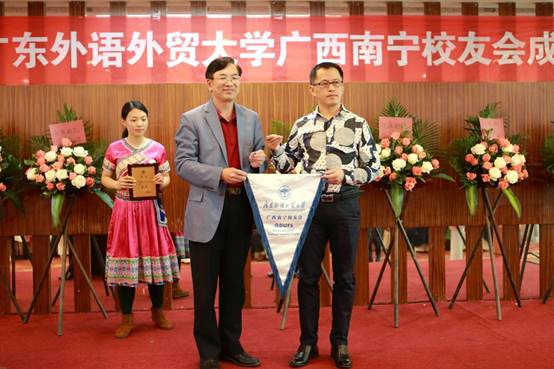 何传添副校长向南宁校友会第一任会长李辛颁发会旗和聘书