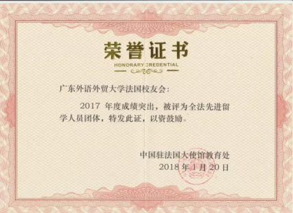广外法国校友会再次受到中国驻法国大使馆教育处的表彰,被评为2017年全法先进留学人员团体。