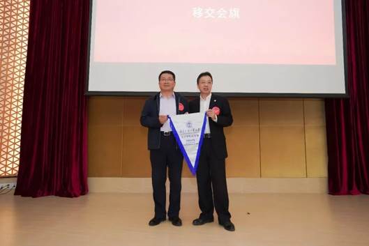 第一届会长刘中华向第二届会长余鹏翼移交会旗